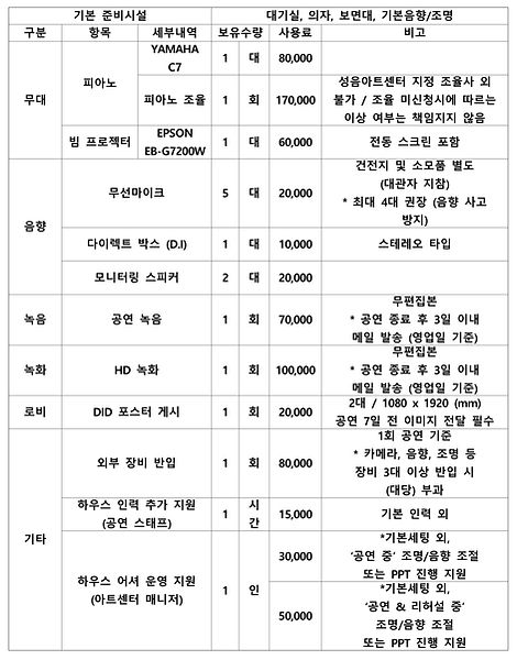 1. 홀연습, 레슨 등 공연 성격 외의 개인적인 사용만 가능하며, 이 경우에는 피아노 비용이 포함되어 있습니다.